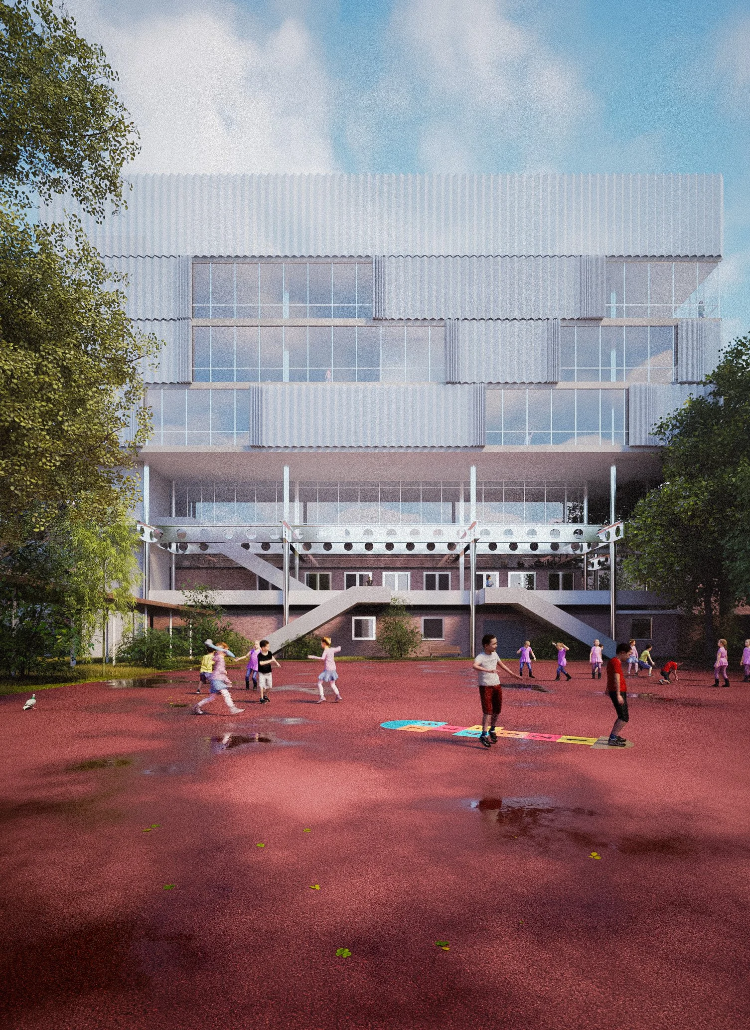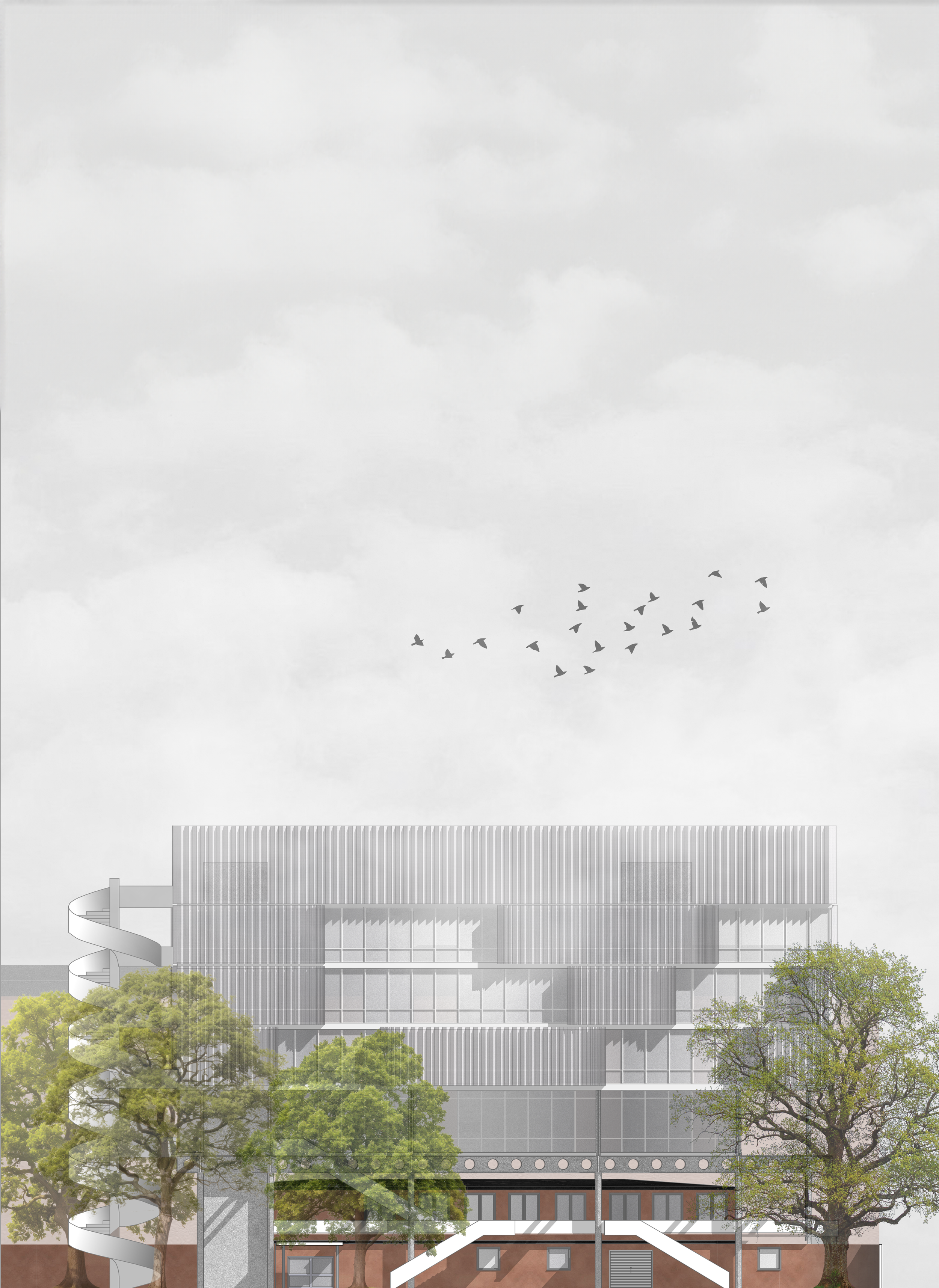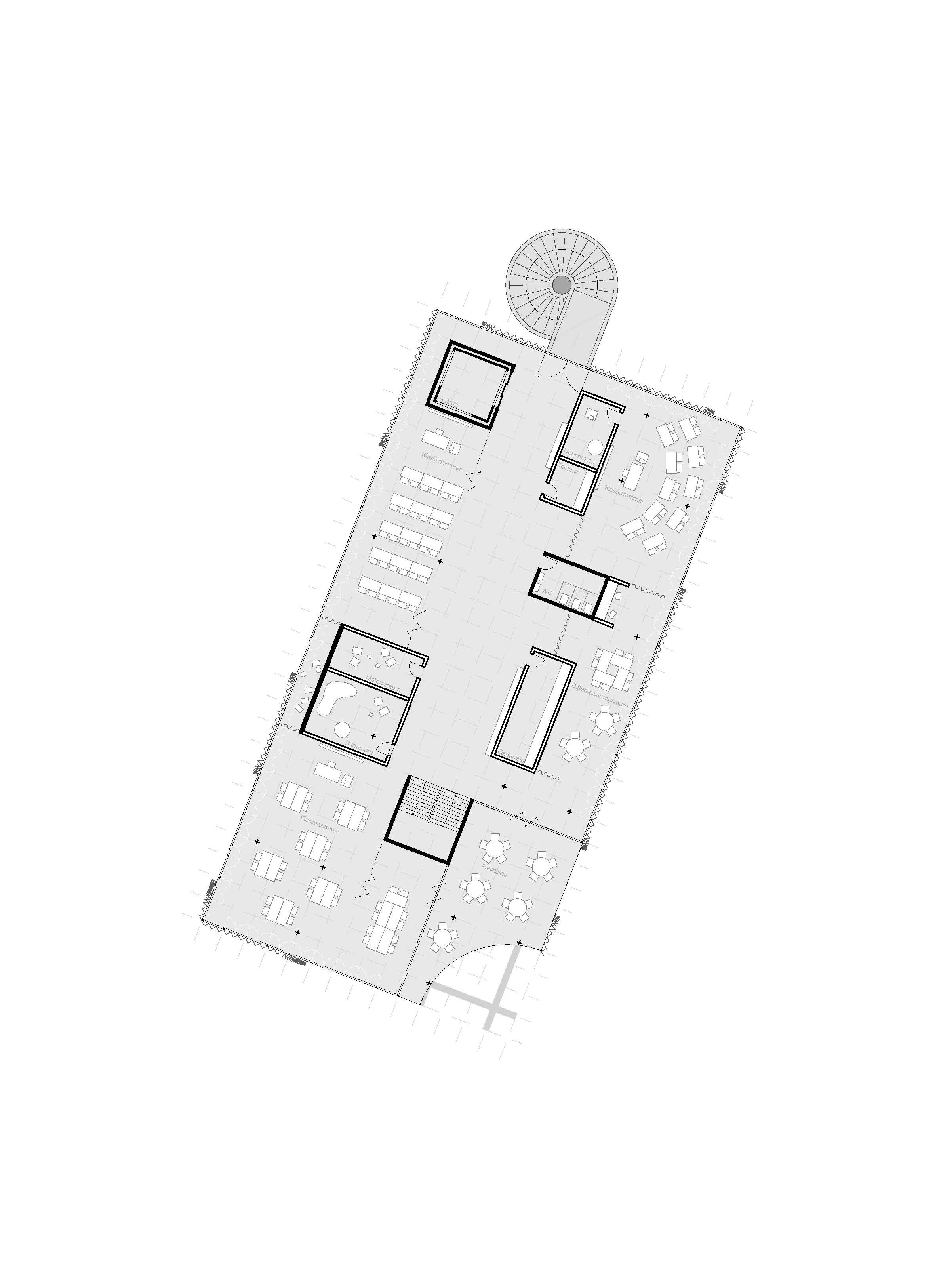 An old school in Munich becomes the ground; above it, a new structure rises — contrast and dialogue, old and new held together. The hall stays the heart, the addition a horizon: a flowing space, open to encounter, to individual paths of learning, to respect and exchange. Architecture as framework, not formula — allowing education to shift, to move, to find its own form.