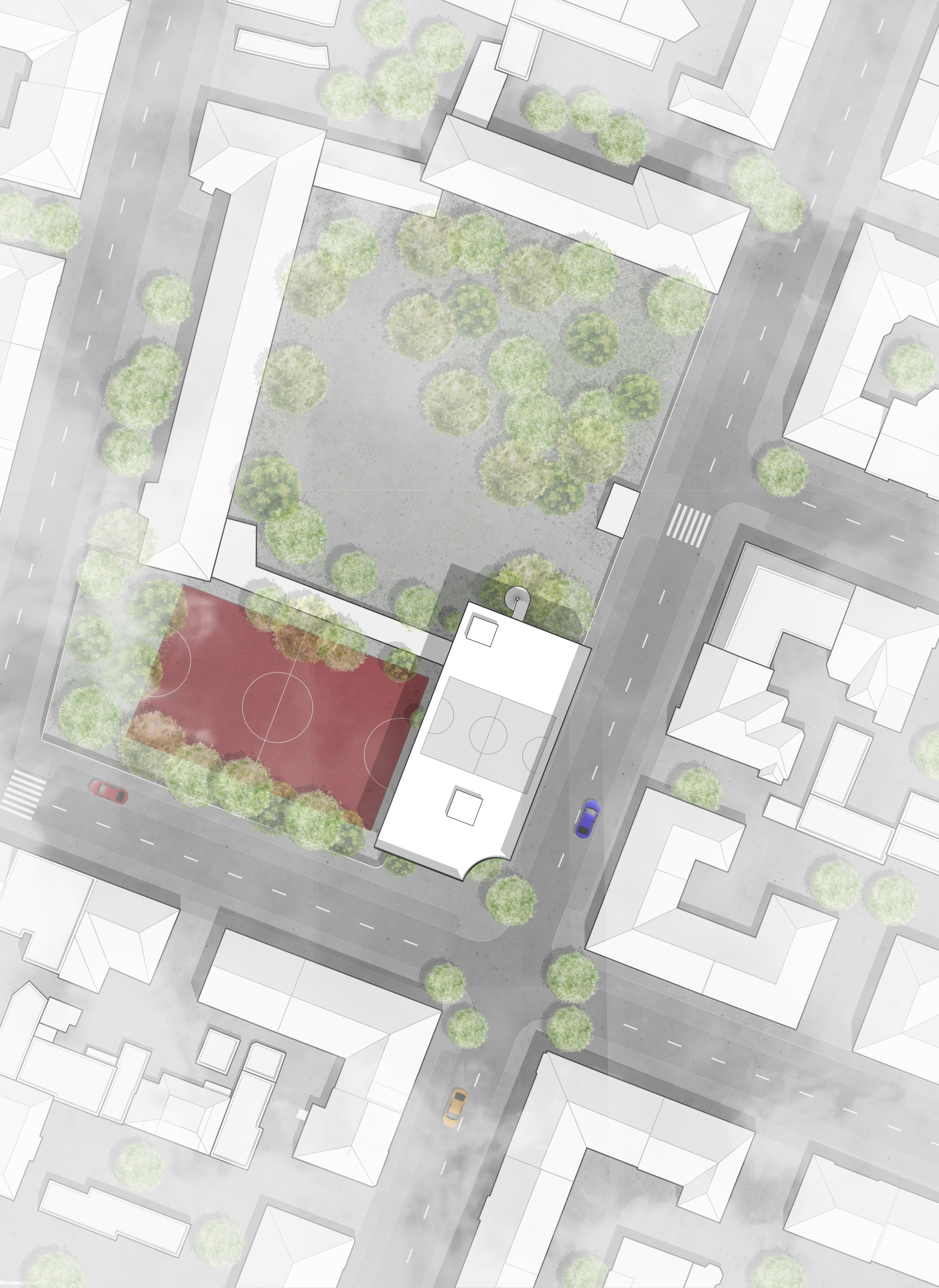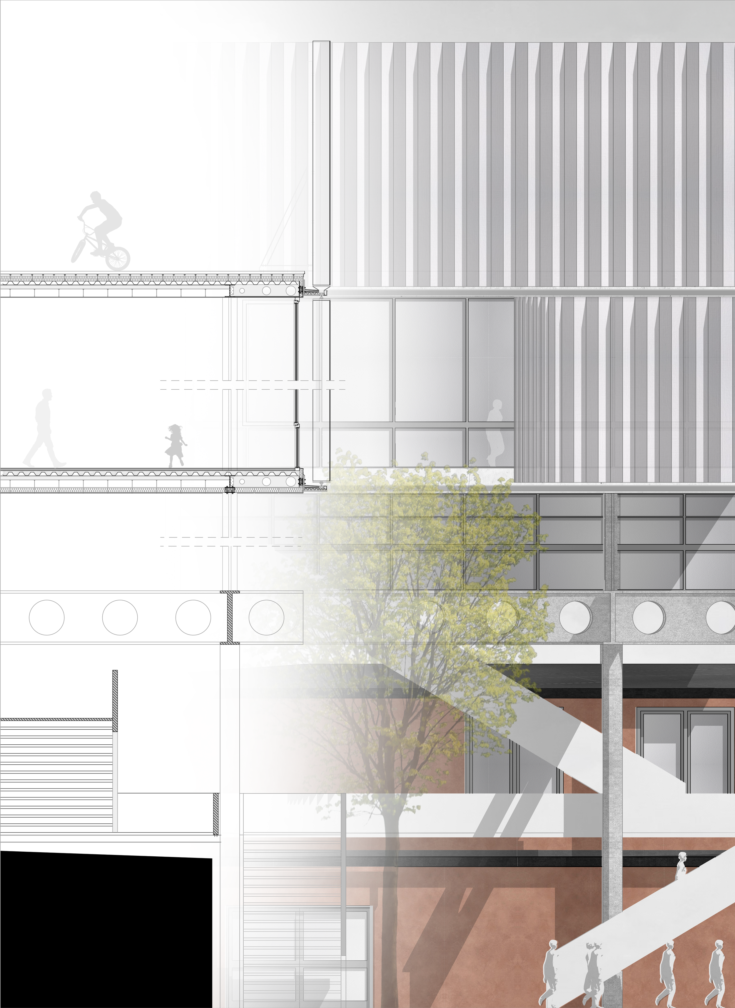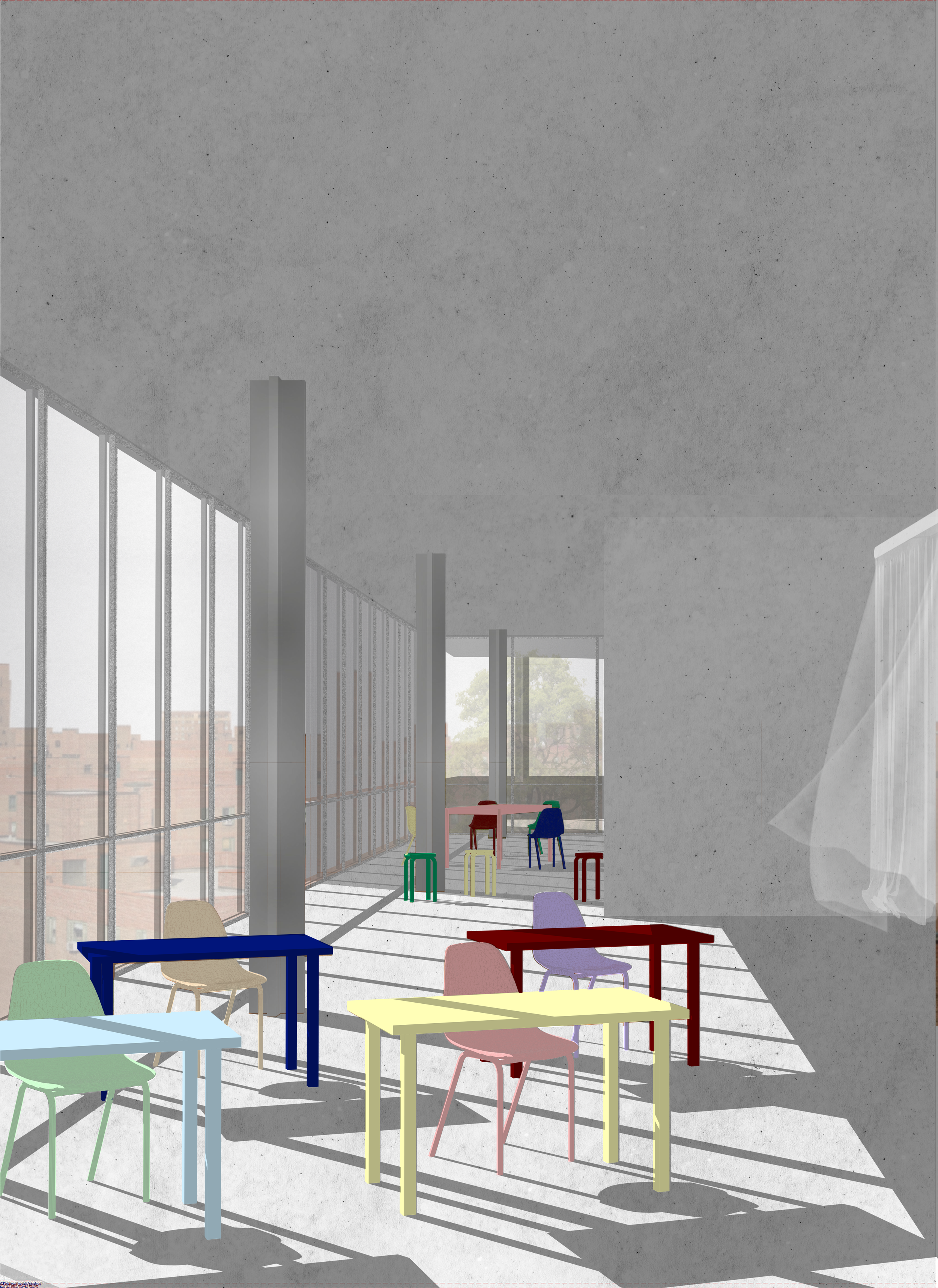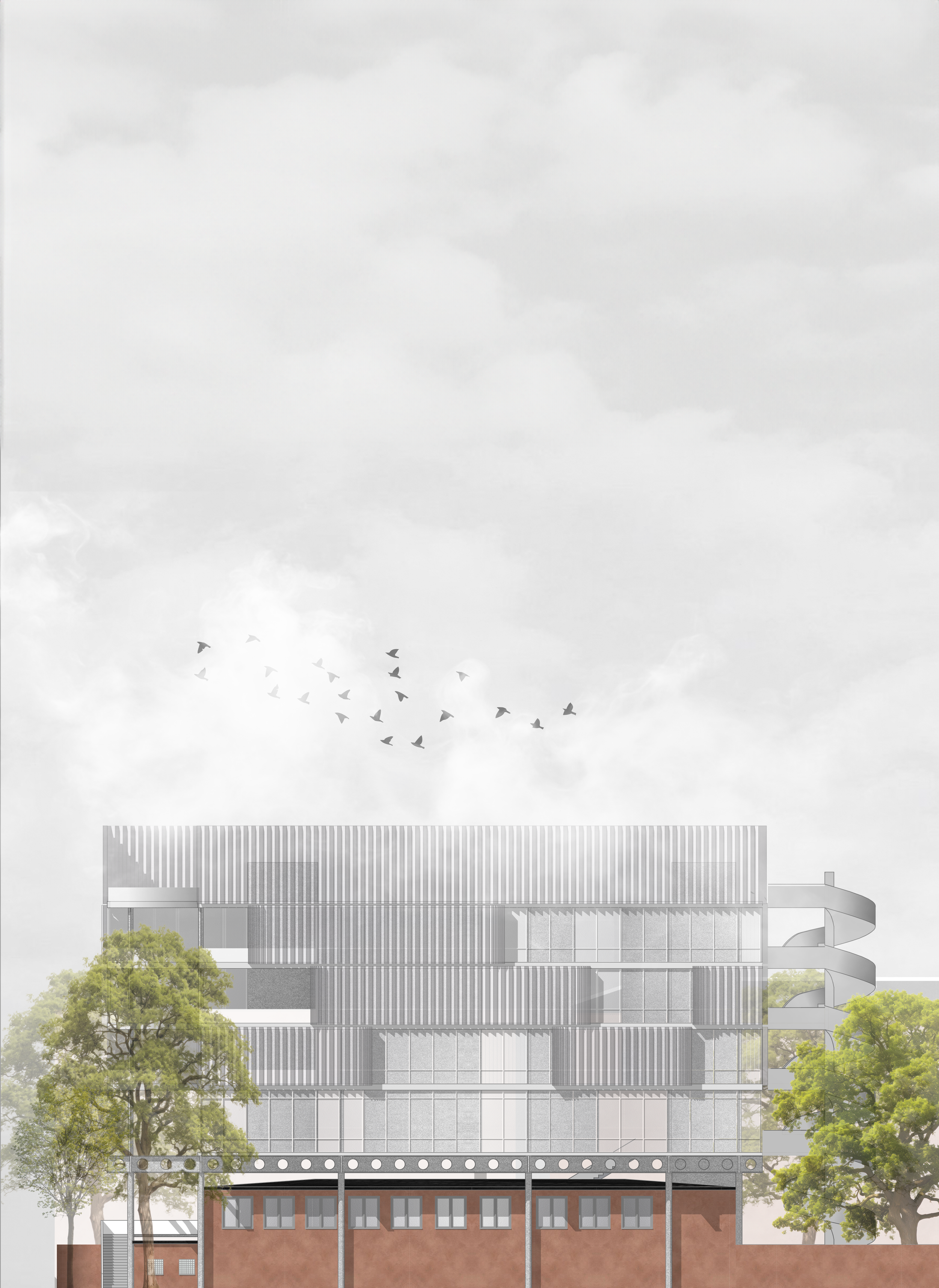 An old school in Munich becomes the ground; above it, a new structure rises — contrast and dialogue, old and new held together. The hall stays the heart, the addition a horizon: a flowing space, open to encounter, to individual paths of learning, to respect and exchange. Architecture as framework, not formula — allowing education to shift, to move, to find its own form.