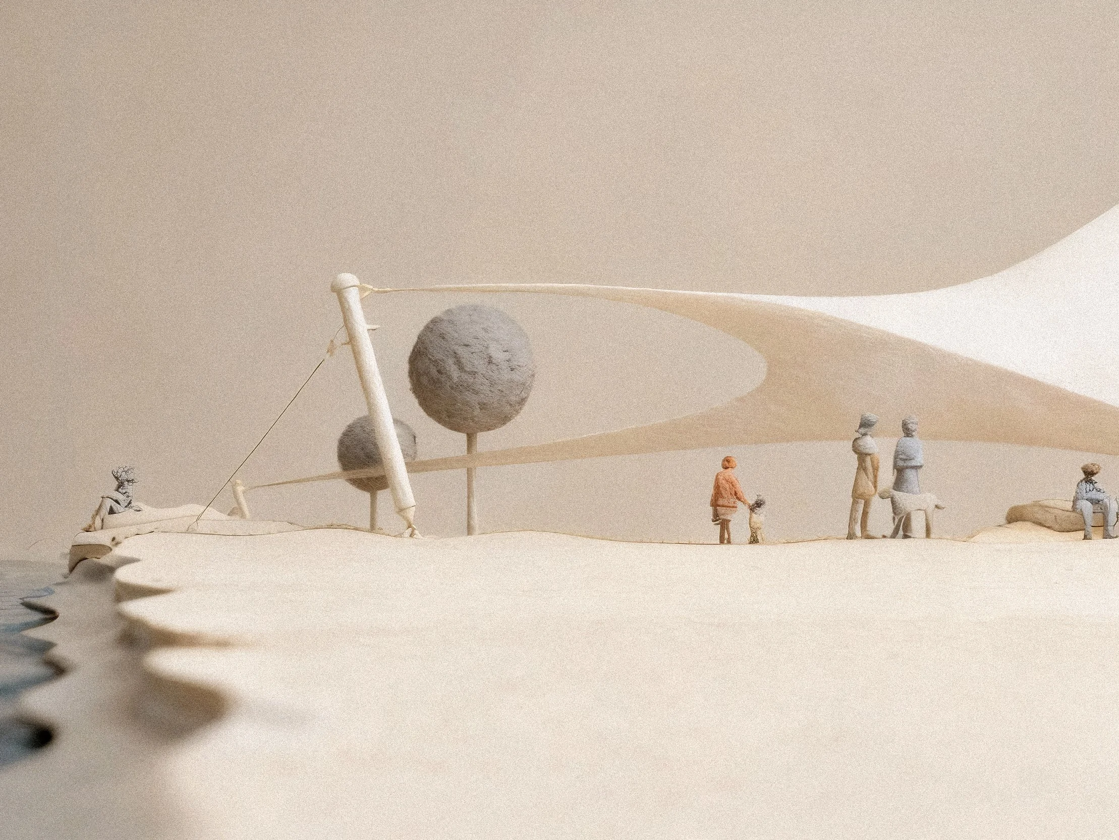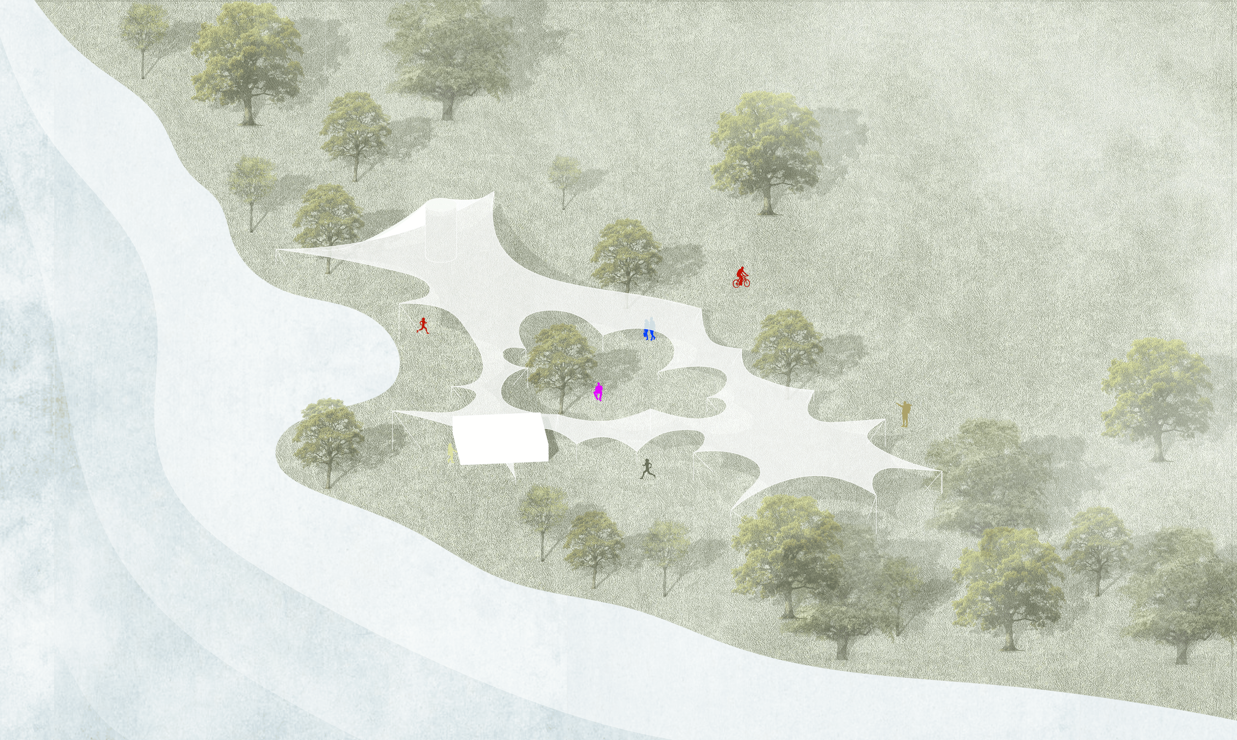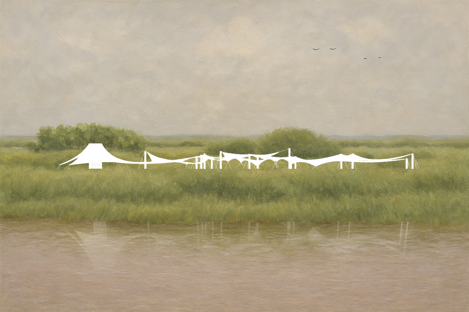 A single membrane rises and folds, shaping spaces of varied scale — intimate corners, open thresholds, playful arcs. Life flows beneath and around it, shifting with the river’s rhythm, a dance of presence and absence. Light and shade trace the structure, while the village gathers in its shadow. Architecture becomes gesture, ephemeral yet enduring, a resilient stage for community, reflection, and encounter.