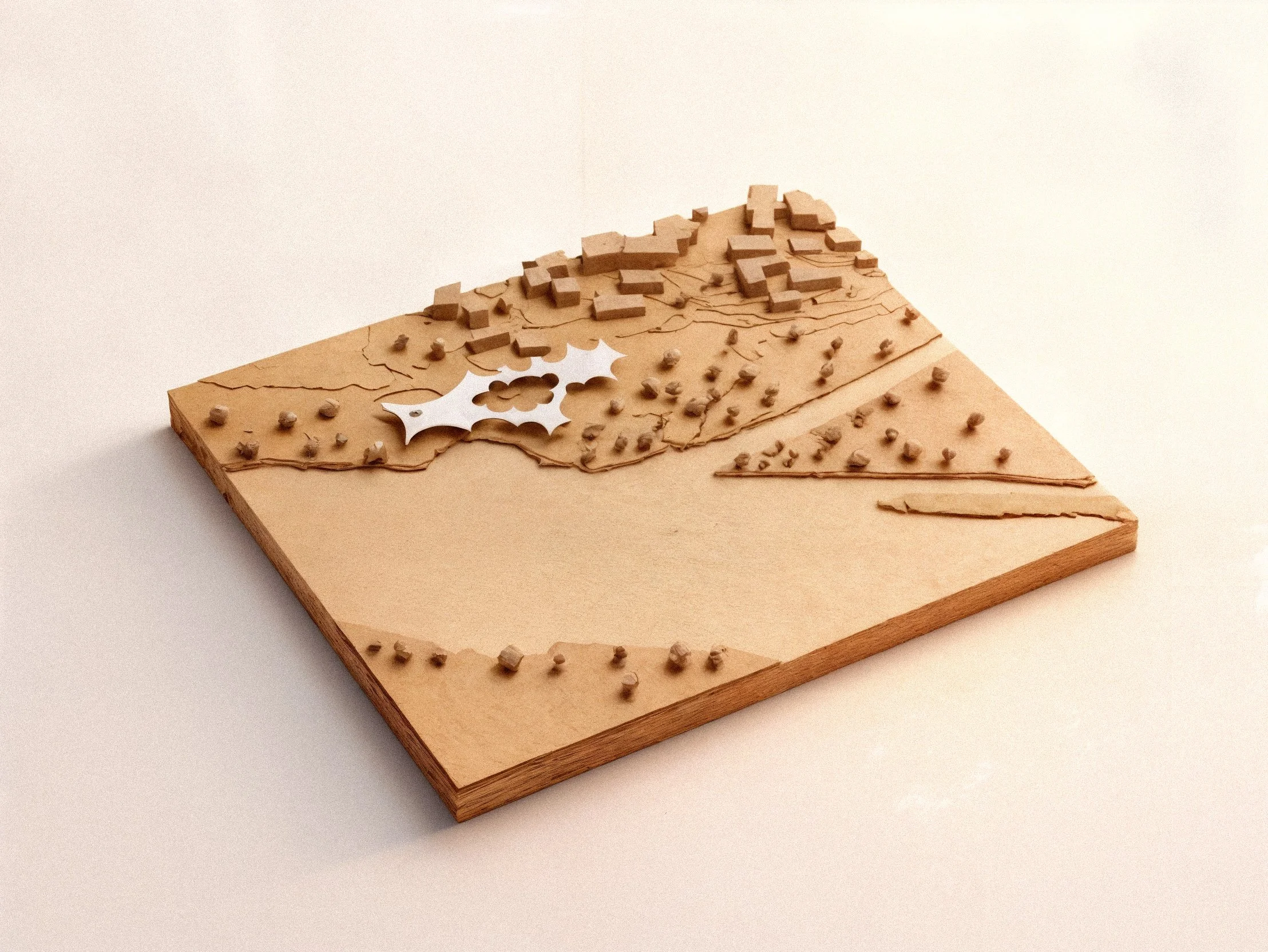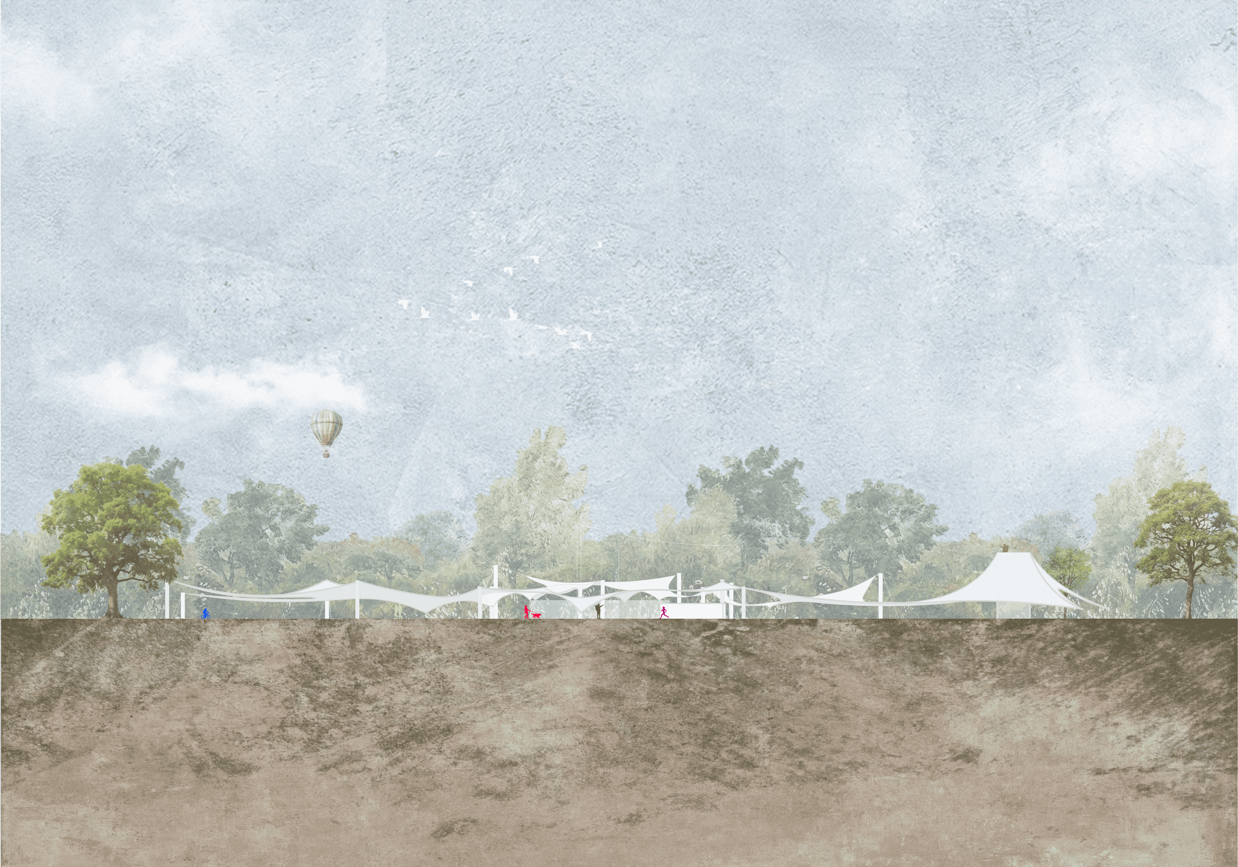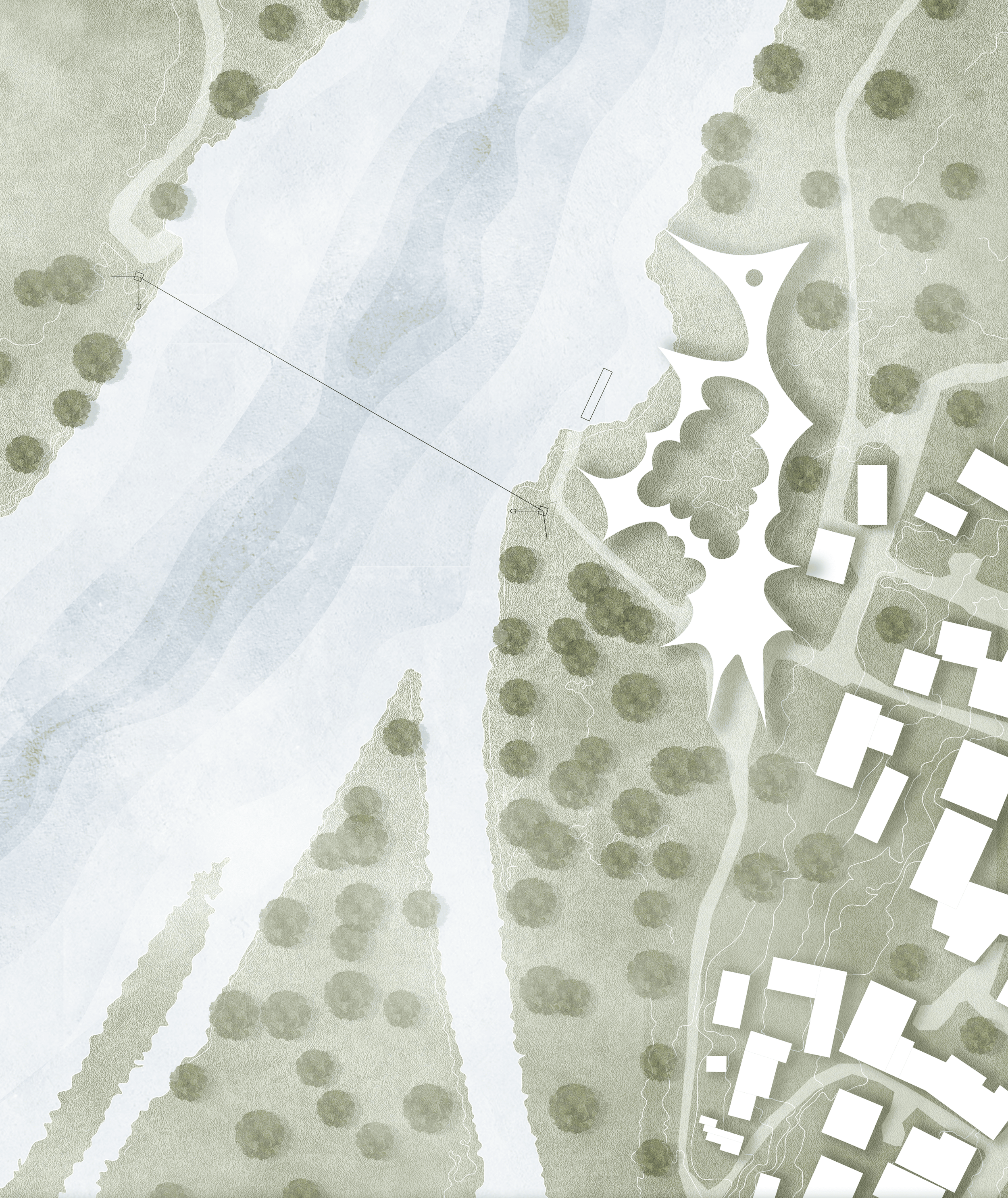 A single membrane rises and folds, shaping spaces of varied scale — intimate corners, open thresholds, playful arcs. Life flows beneath and around it, shifting with the river’s rhythm, a dance of presence and absence. Light and shade trace the structure, while the village gathers in its shadow. Architecture becomes gesture, ephemeral yet enduring, a resilient stage for community, reflection, and encounter.